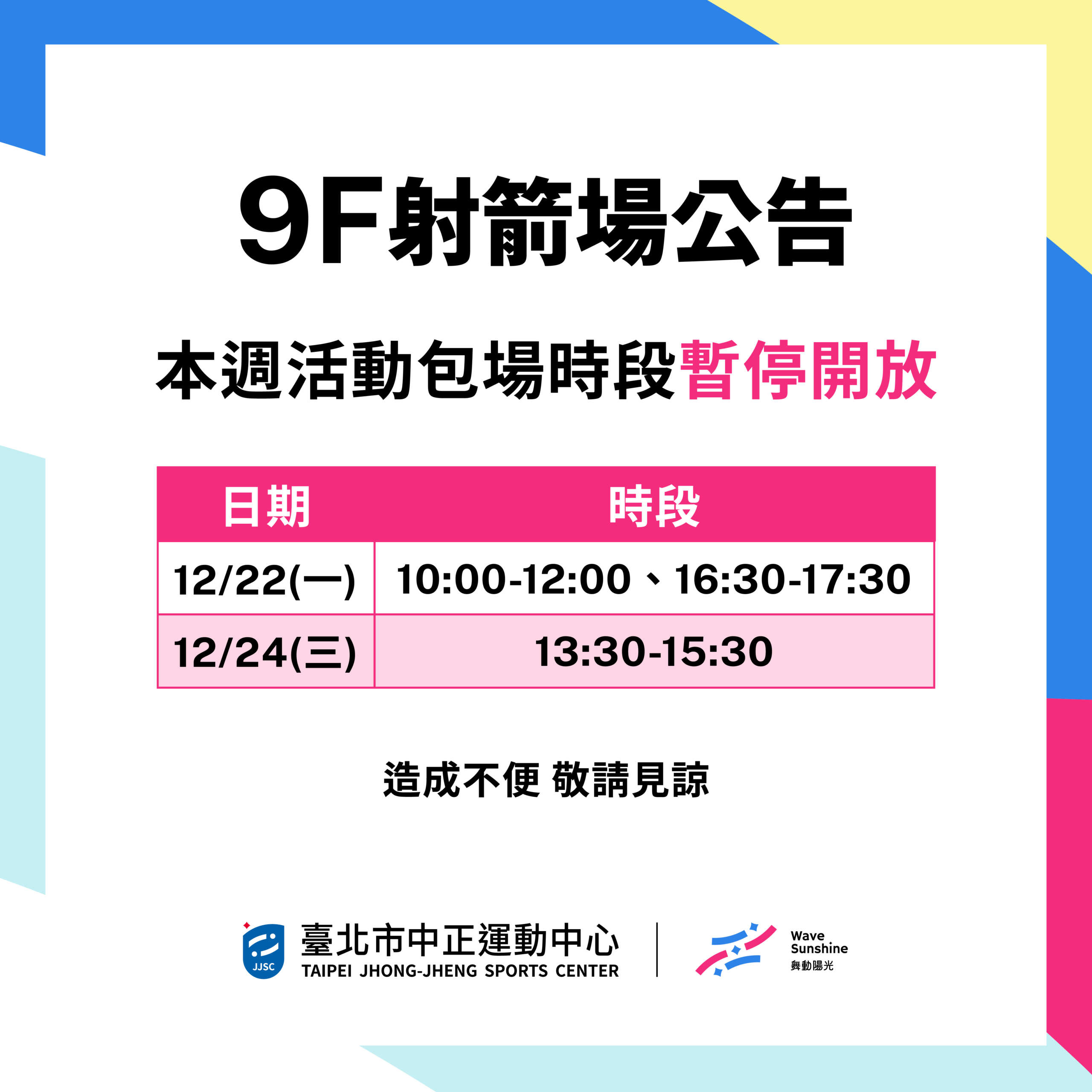 【9F 射箭場】12/22-12/27 包場時段暫停開放