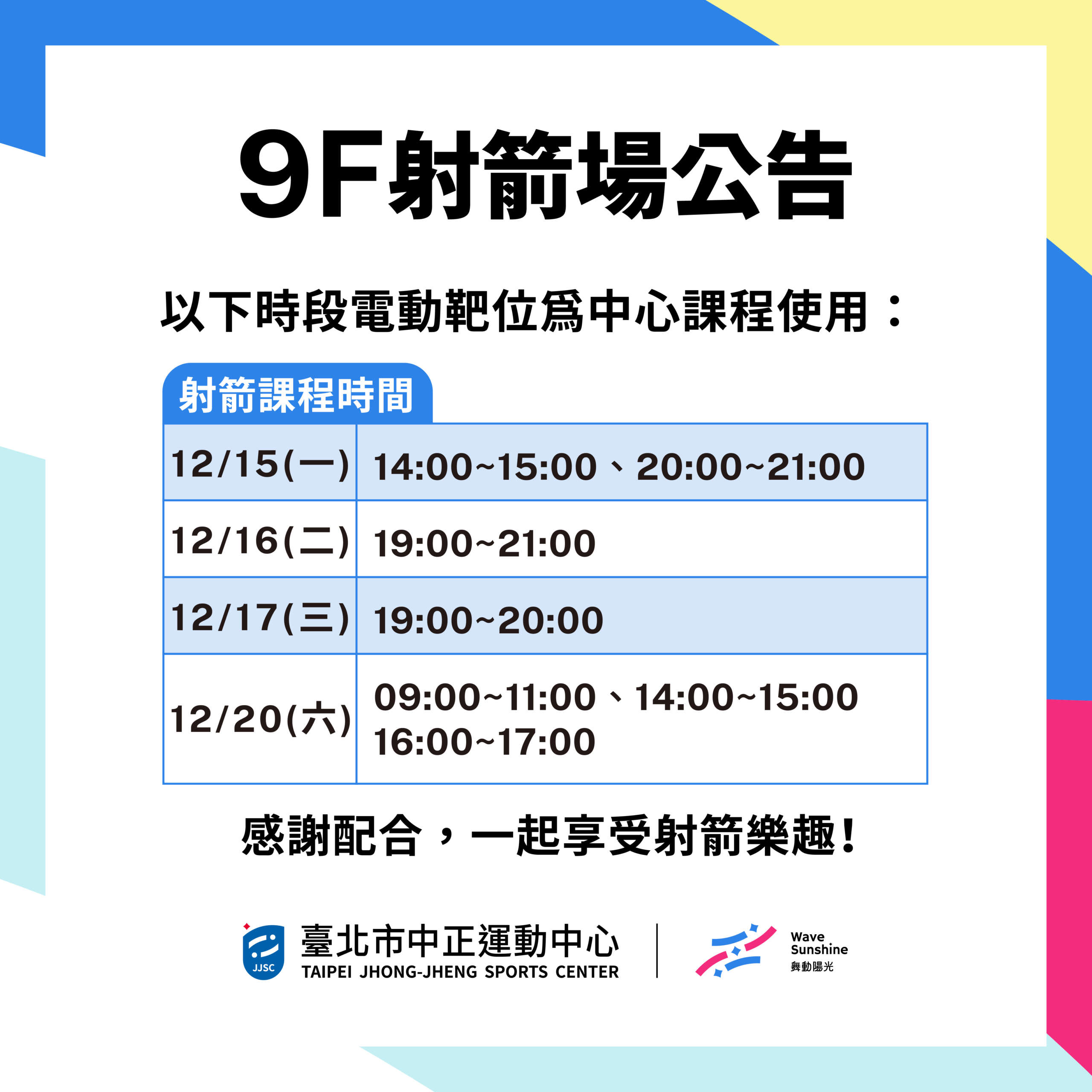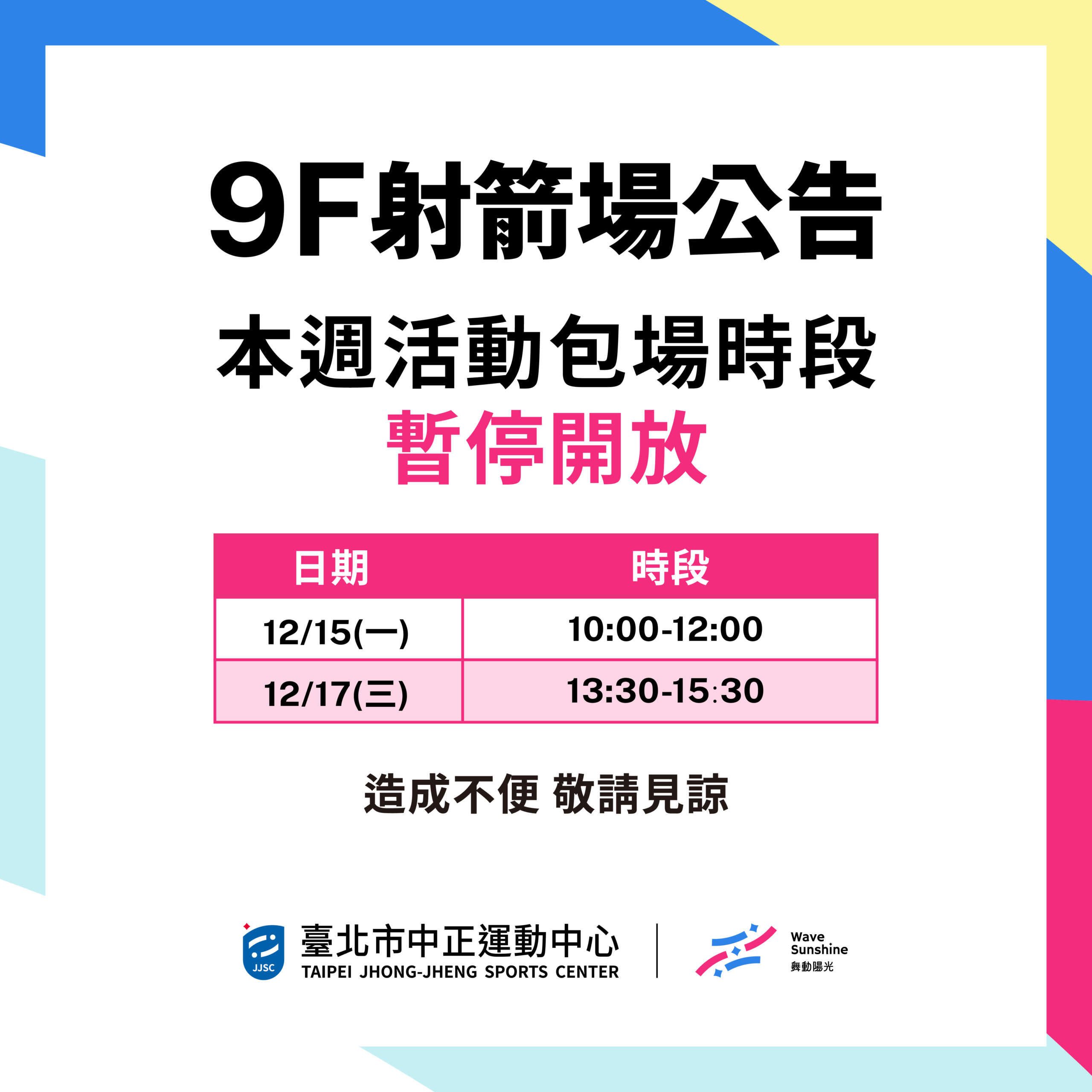 【9F 射箭場】12/15-12/20 包場時段暫停開放
