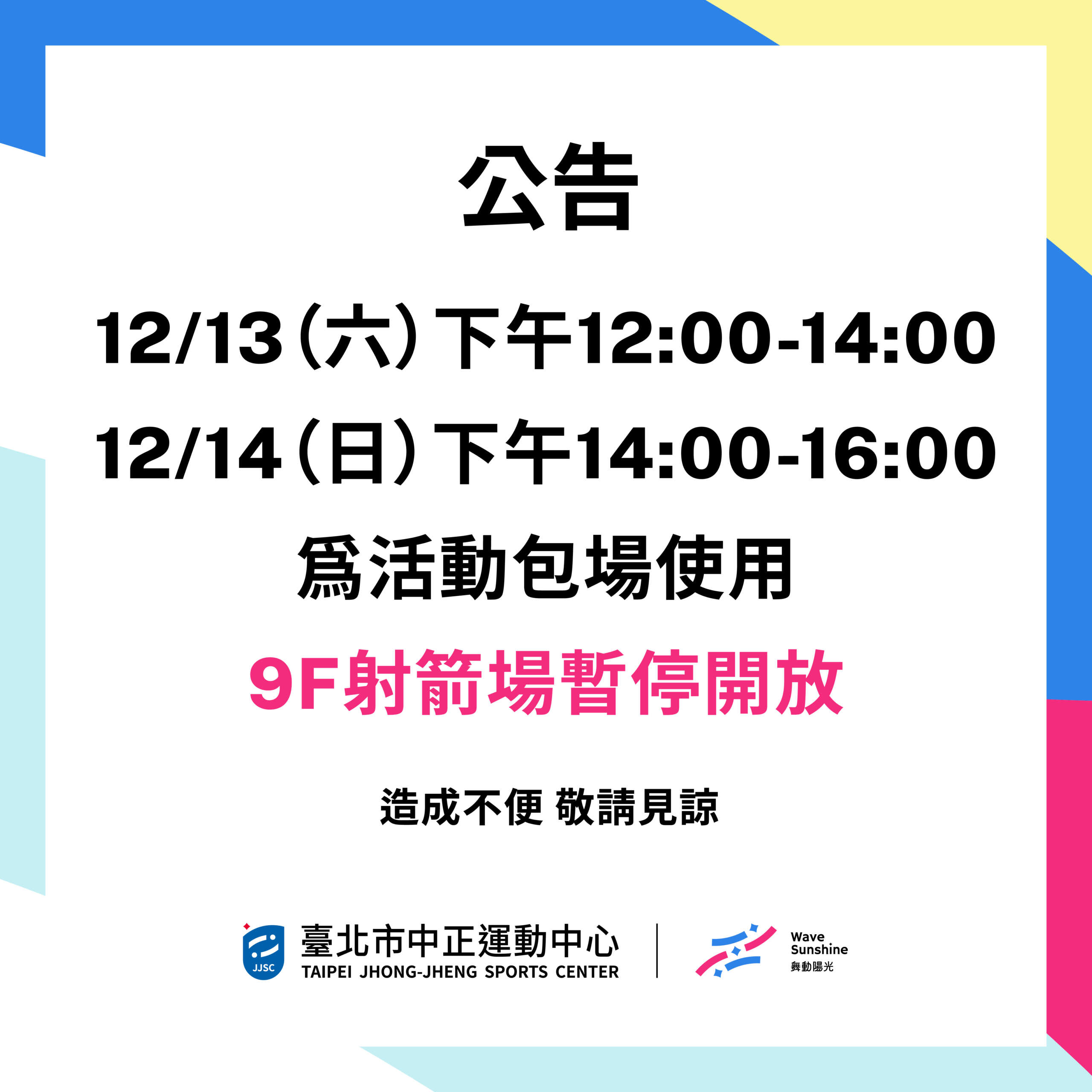 【9F 射箭場】12/13-12/14 包場時段暫停開放