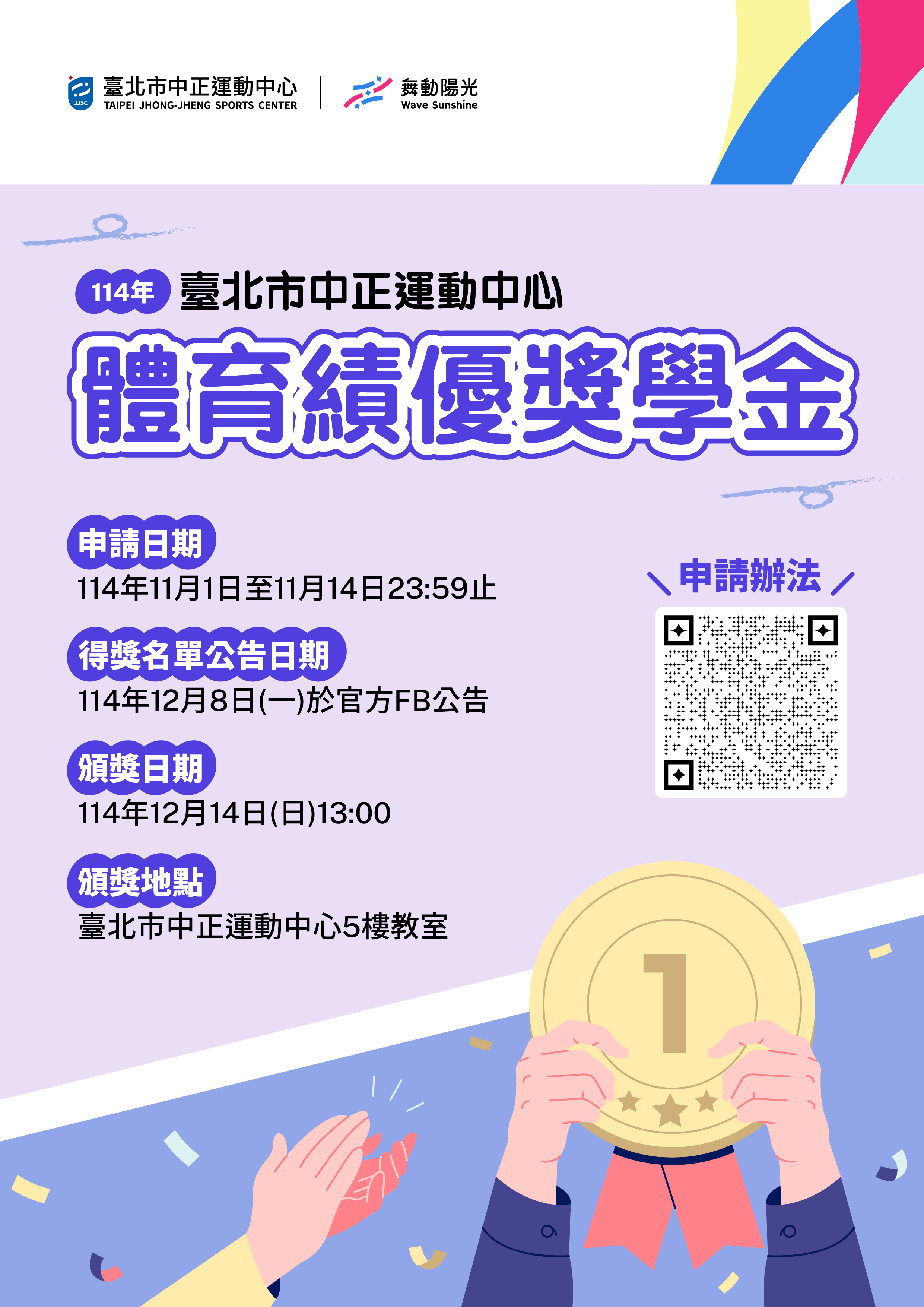 2025-10-03 wsjjscadmin in 最新活動 3566 努力揮汗的每一位孩子,都值得被看見 ✦ 申請資訊如下: 申請日期|𝟭𝟭𝟰/𝟭𝟭/𝟭 ⮕ 𝟭𝟭𝟰/𝟭𝟭/𝟭𝟰 𝟮𝟯:𝟱𝟵止 名單公告|𝟭𝟭𝟰/𝟭𝟮/𝟴(一) 於本中心𝗙𝗕公開 頒獎日期|𝟭𝟭𝟰/𝟭𝟮/𝟭𝟰(日) 𝟭𝟯:𝟬𝟬 頒獎地點|臺北市中正運動中心 𝟱樓教室 申請辦法 ☛ https://reurl.cc/7VxKn5 ❀ 邀請所有中正區的體育績優運動小將們,千萬別錯過這份專屬於你的榮耀時刻! #中正運動中心 #體育績優獎學金