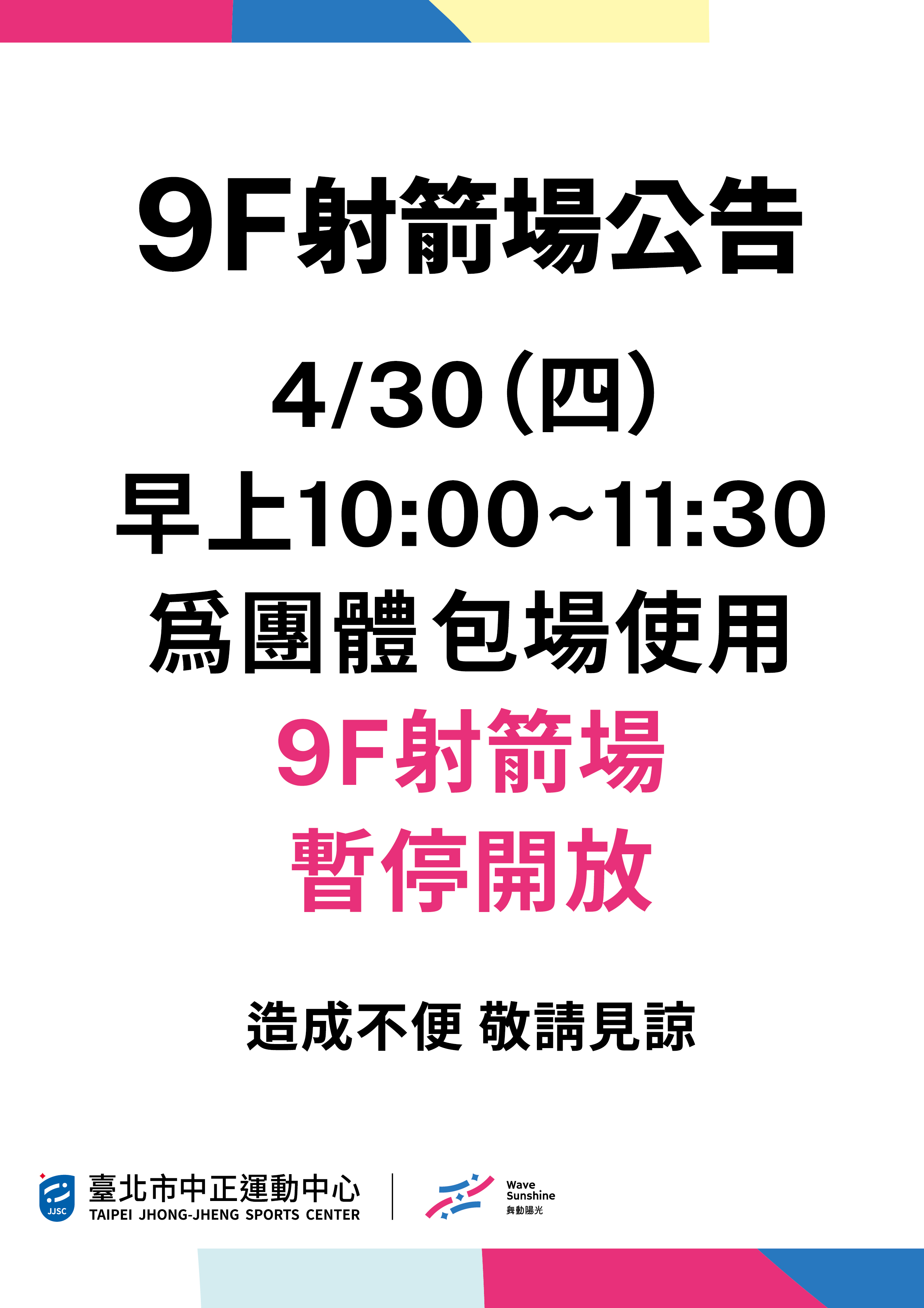 【𝟗𝐅 射箭場】𝟒/𝟑𝟎 (四) 包場時段暫停開放