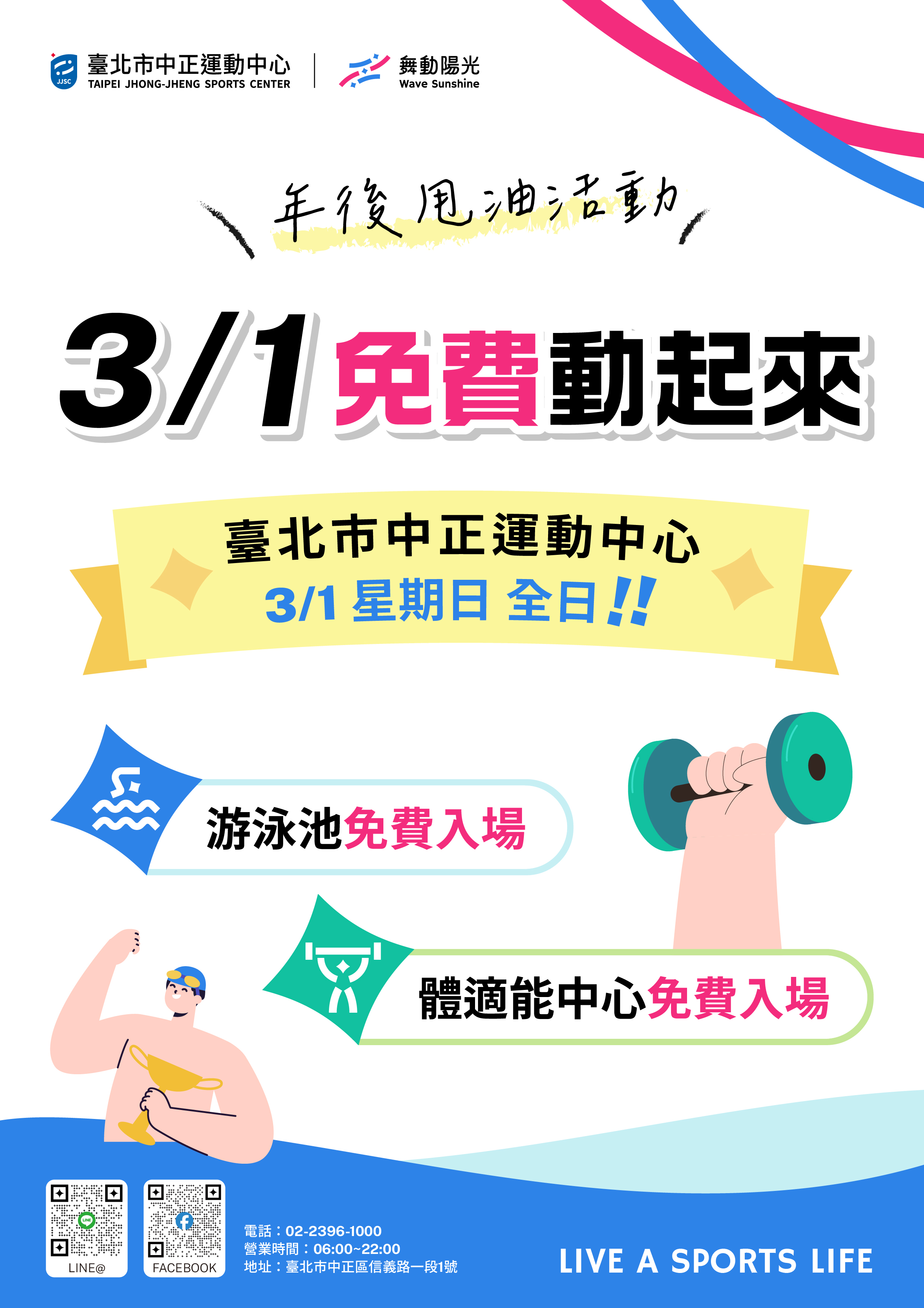 18 days ago wsjjscadmin in 最新活動 2687 𒀹中正運動中心 𝟑/𝟏 免費動起來𒑠 年後甩油別再等! 𝟑/𝟏(日)到 中正運動中心 游泳池→ 免費入場 健身房→ 免費入場 開工第一週,把過年熱量通通甩掉 揪朋友一起免費動起來!