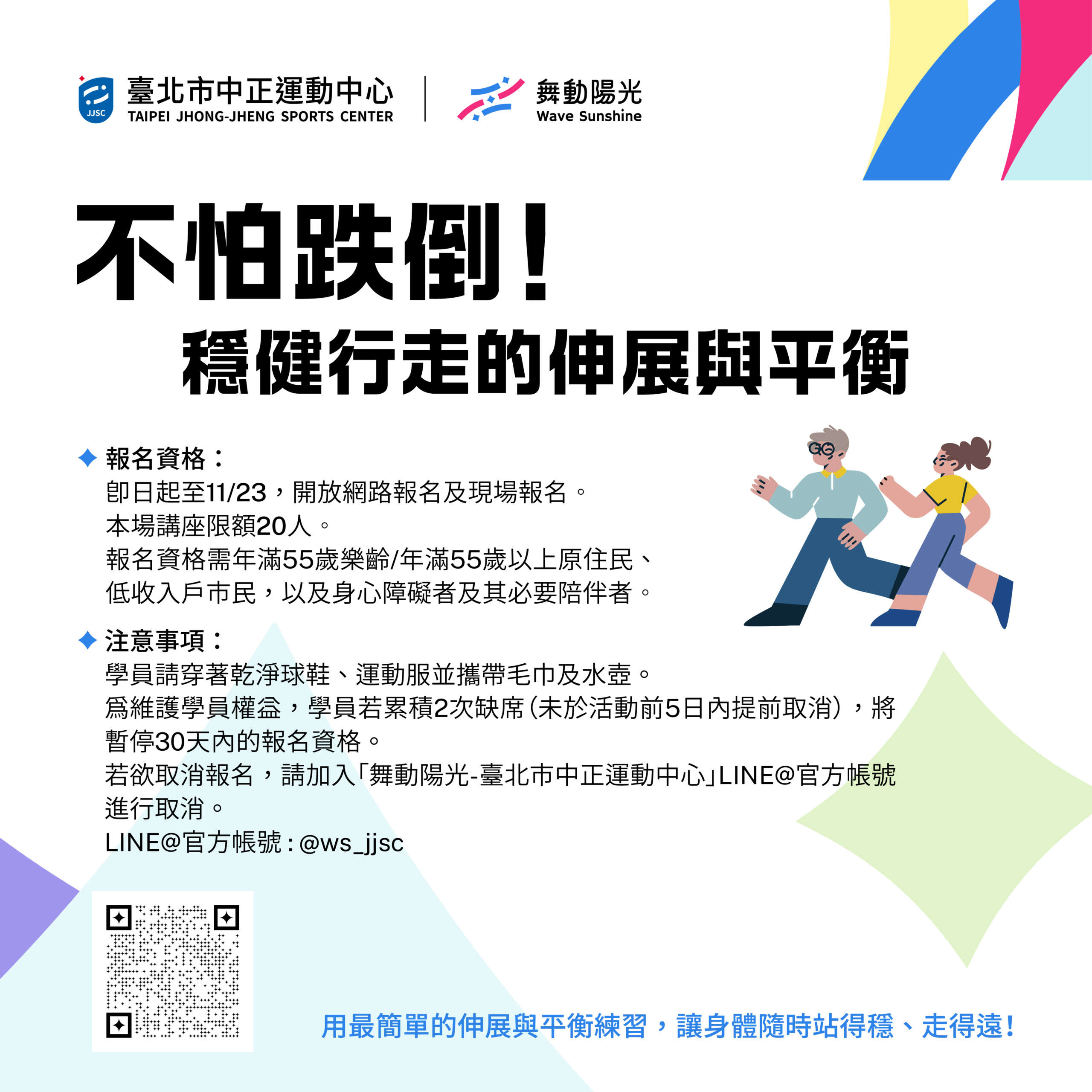 19 days ago wsjjscadmin in 最新活動 776 【𝟭𝟭/𝟮𝟰 免費公益講座】 融合伸展與平衡訓練,改善僵硬提升穩定度 讓走路、上下樓梯、彎腰拿東西更輕鬆 ! ➤ 即日起至 𝟭𝟭/𝟮𝟯 網路報名,限額𝟮𝟬人 ✔︎ 報名 贈中正運動中心 貴賓券𝟭張 地點 : 中正運動中心 𝟲𝟬𝟮教室 時間 : 𝟭𝟬:𝟯𝟬-𝟭𝟭:𝟯𝟬 講師 : 汶汶 ❖ 課程報名|https://reurl.cc/eMD9X7