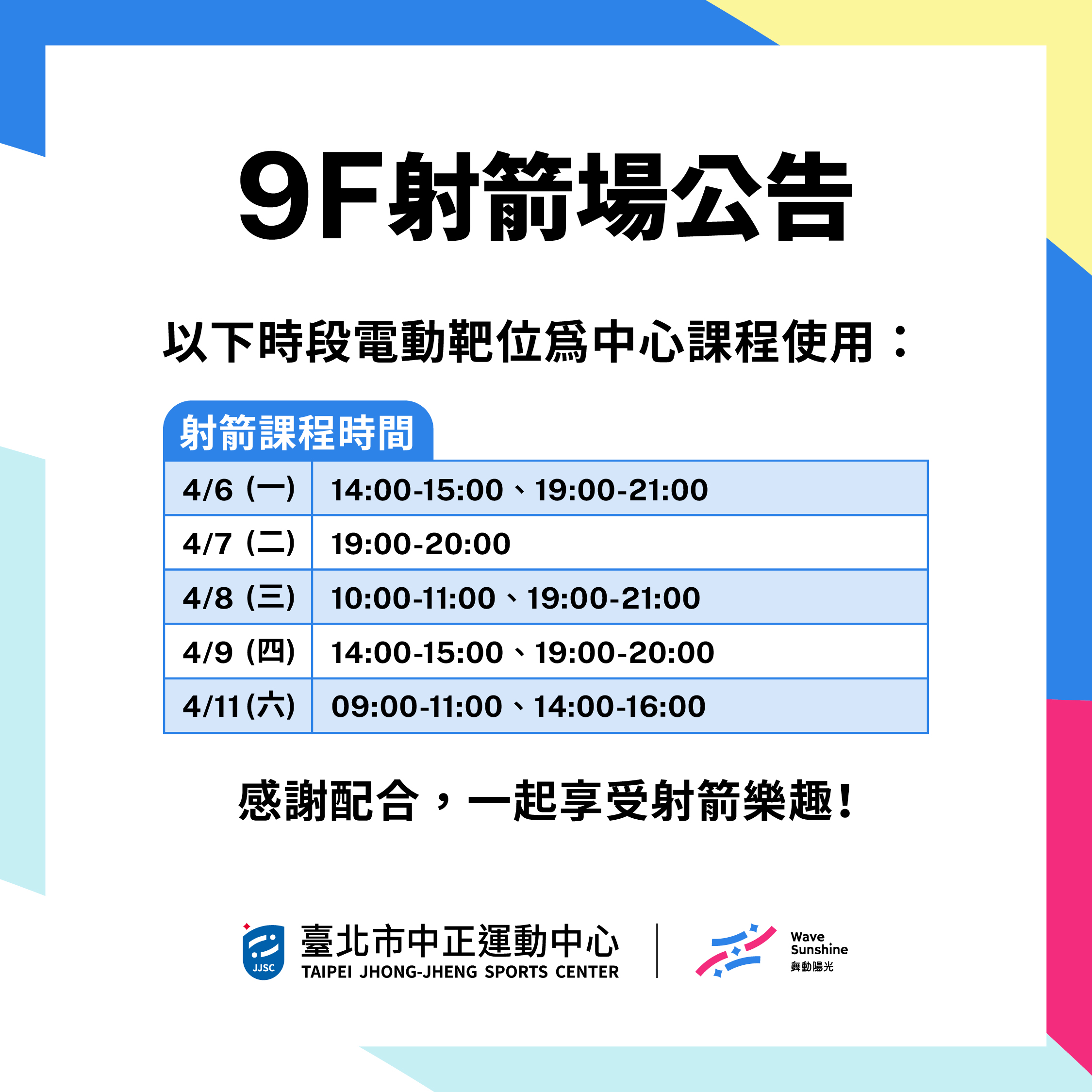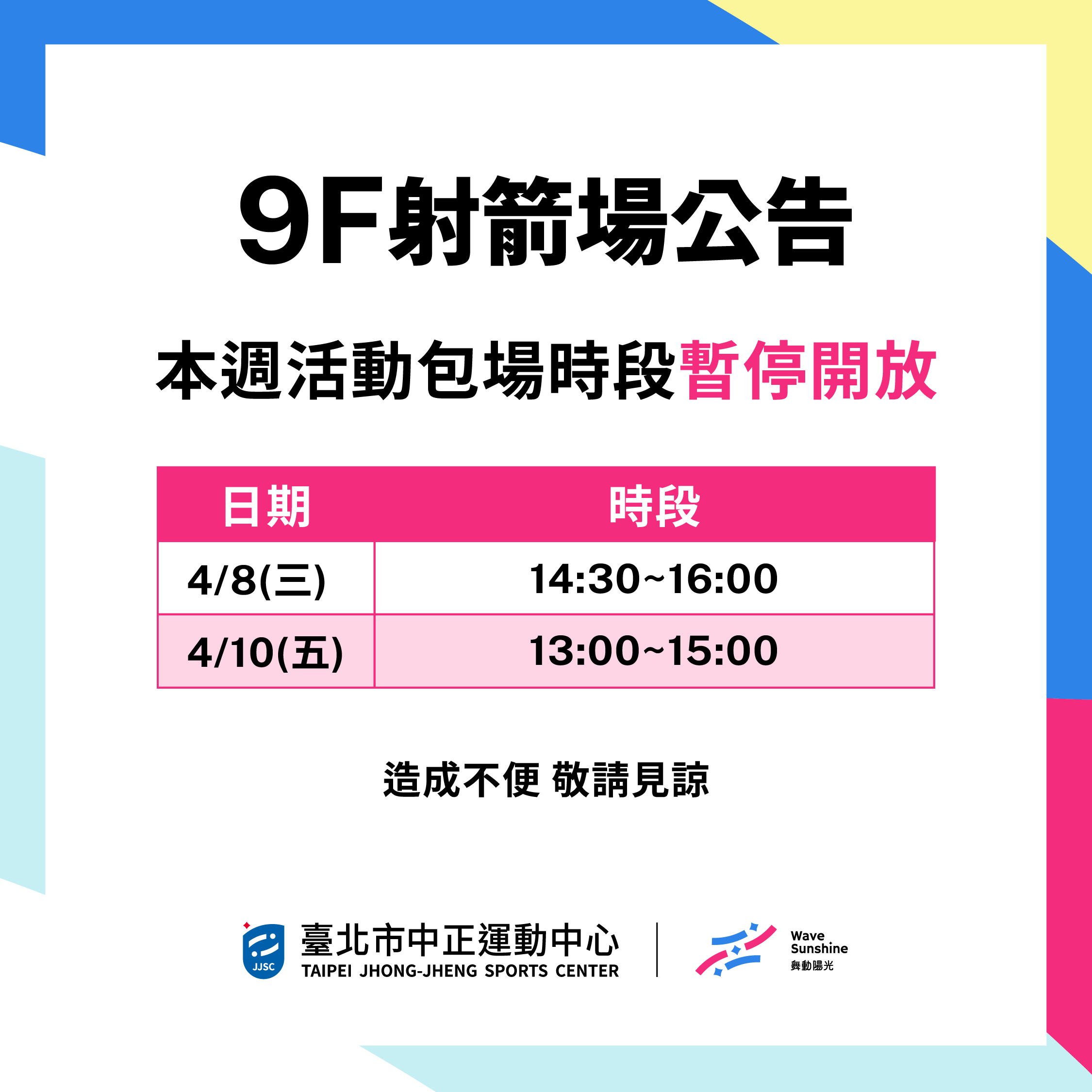 【9F 射箭場】4/6-4/12 暫停開放時段公告