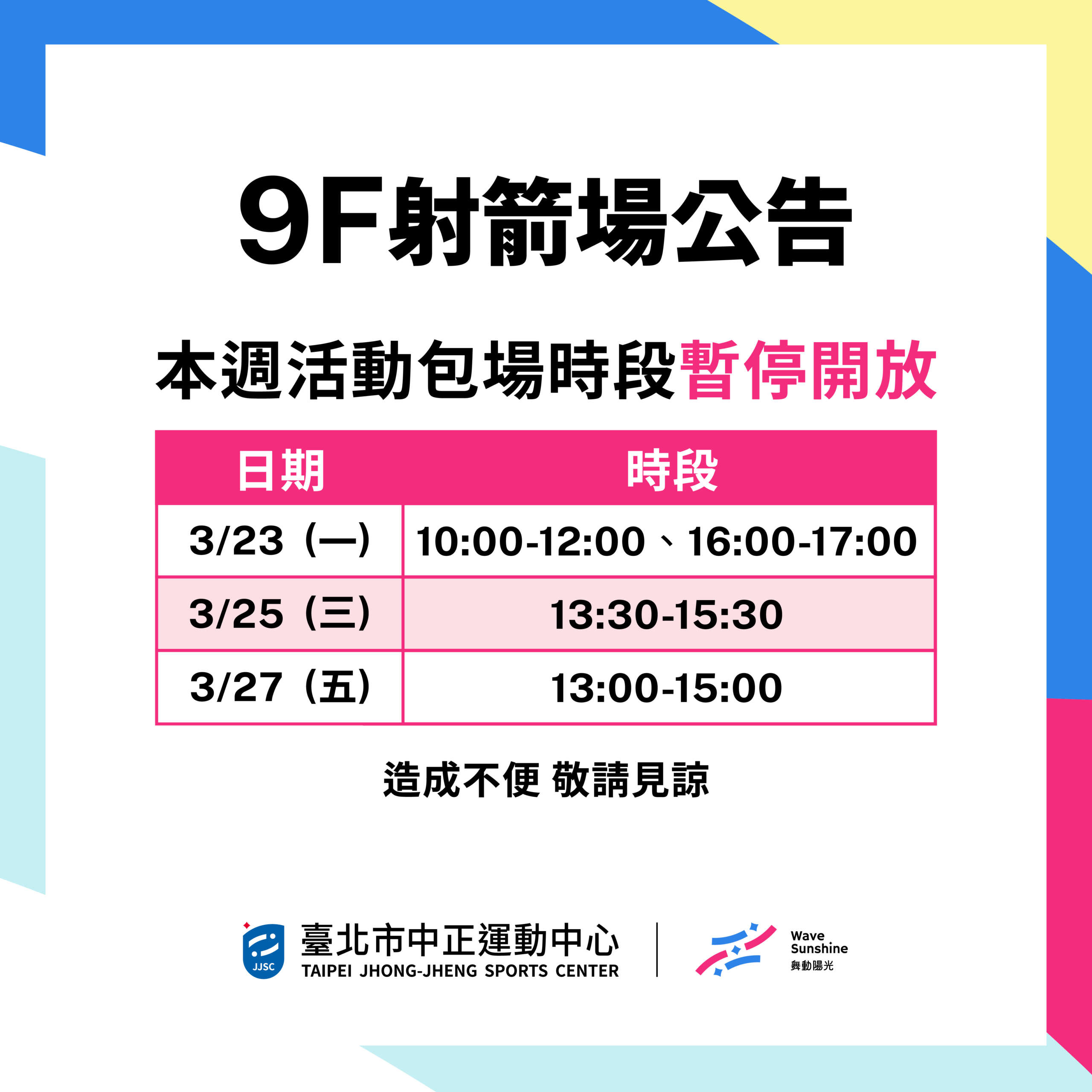 【9F 射箭場】3/23-3/29 暫停開放時段公告