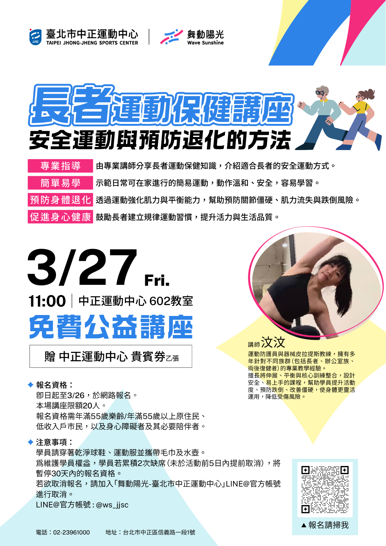 2 hours ago wsjjscadmin in 最新活動 919 𝟯/𝟮𝟳(五) 𝟭𝟭:𝟬𝟬 長者運動保健講座 ✦ 年滿𝟱𝟱歲 ✦ 網路報名 (𝟮𝟬人滿班) ✦ 參加即贈貴賓券一張 即日起至 𝟯/𝟮𝟲 開放線上報名 報名網址 ⮕ https://reurl.cc/dqbMqD