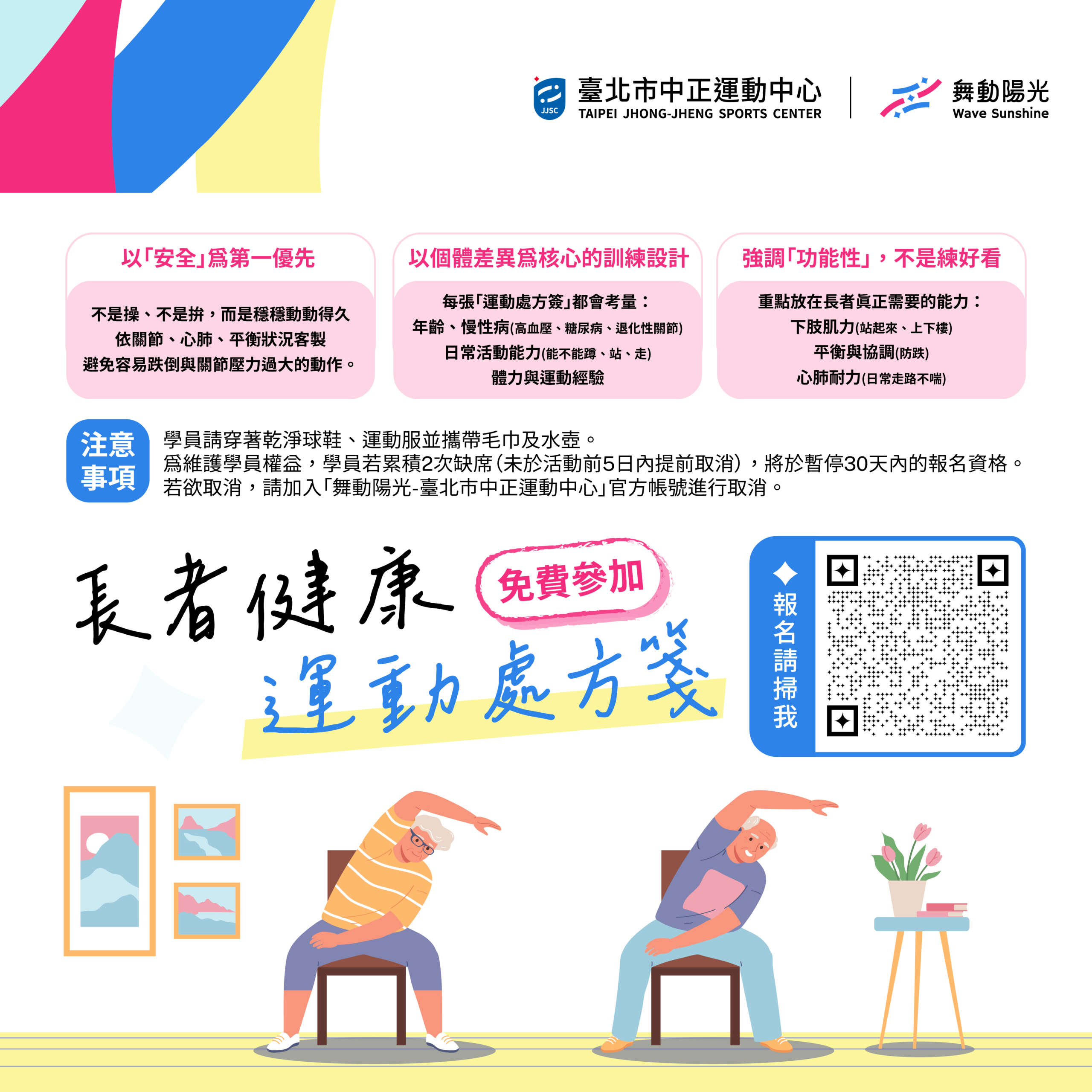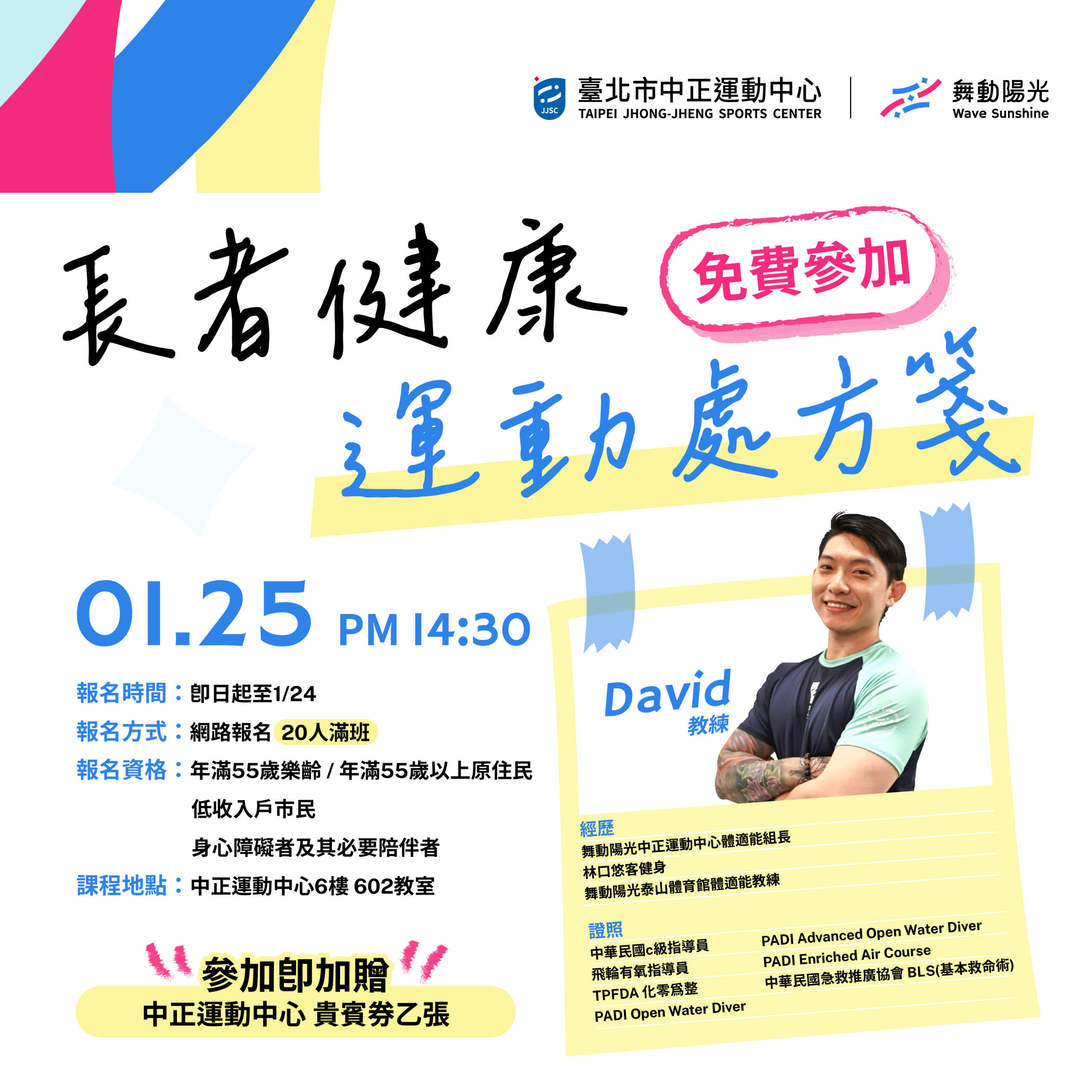 4 days ago wsjjscadmin in 最新活動 197 𝟏/𝟐𝟓 𝟭𝟰:𝟯𝟬 長者健康 運動處方箋✨ ✦ 年滿55歲 ✦ 網路報名 (20人滿班) ✦ 參加即贈貴賓券一張 📌即日起至 𝟭/𝟮𝟰 開放線上報名⮕ https://reurl.cc/dqbMqD