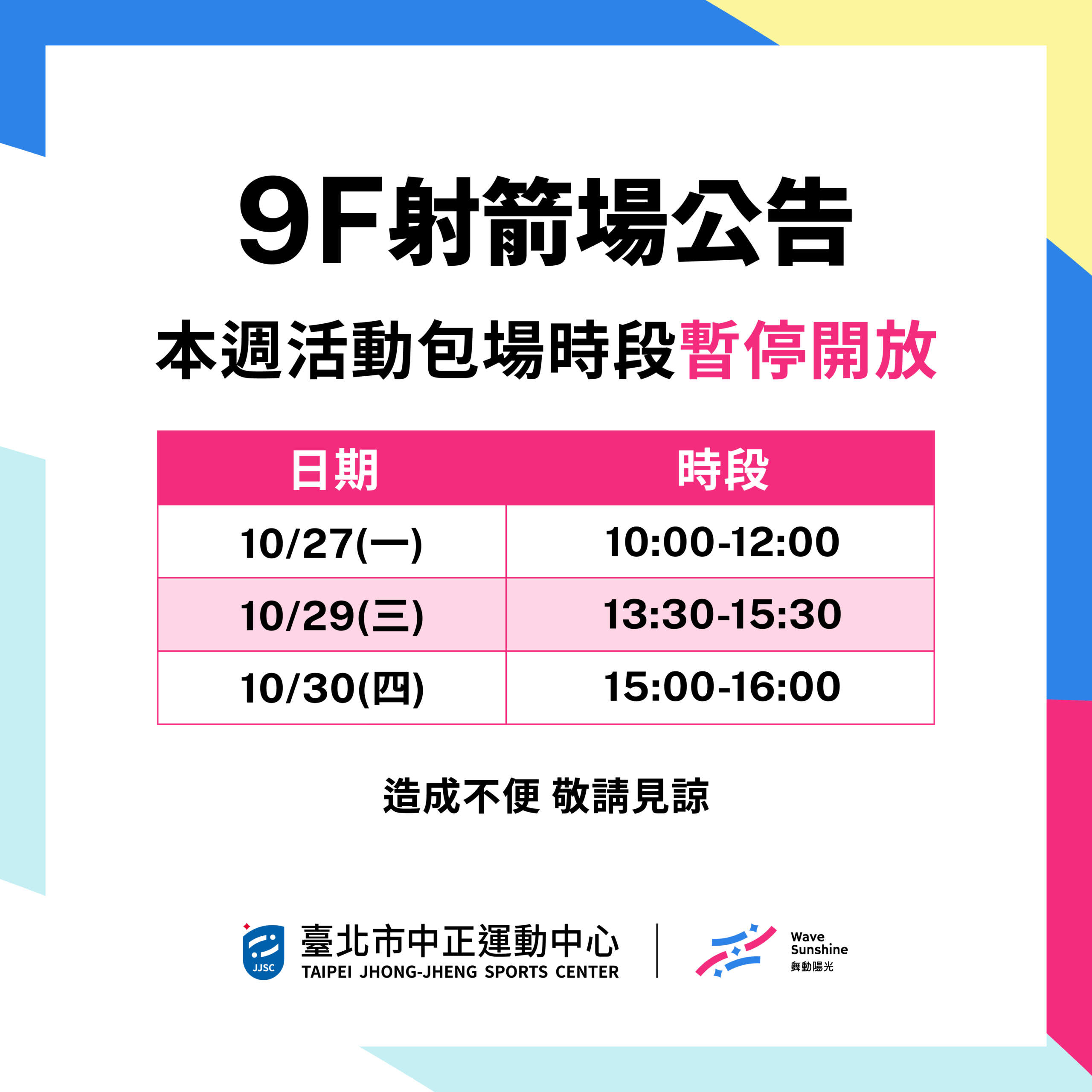 【9樓射箭場】 10/27-11/2 包場及課程公告
