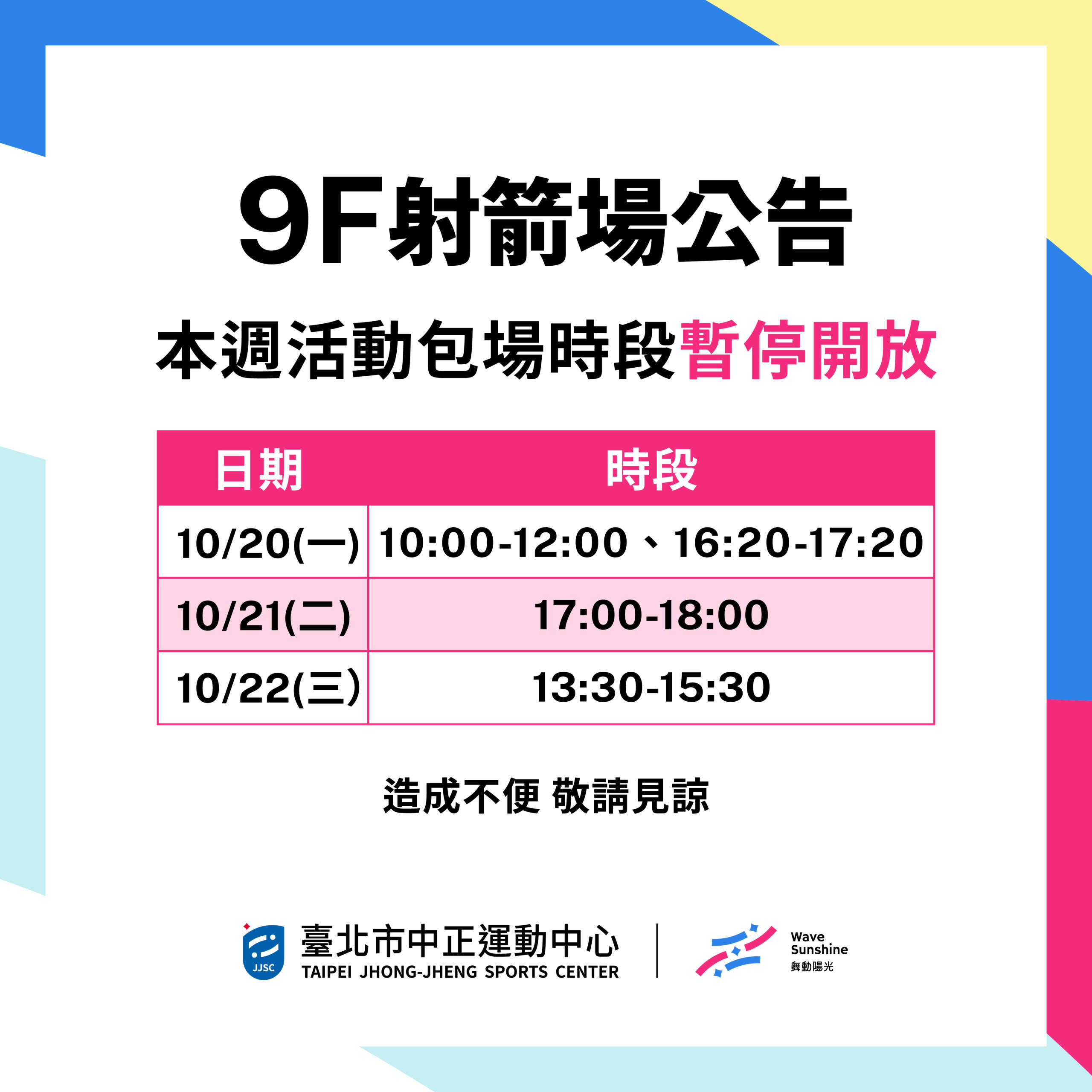 【9樓射箭場】 10/20-10/26 包場及課程公告
