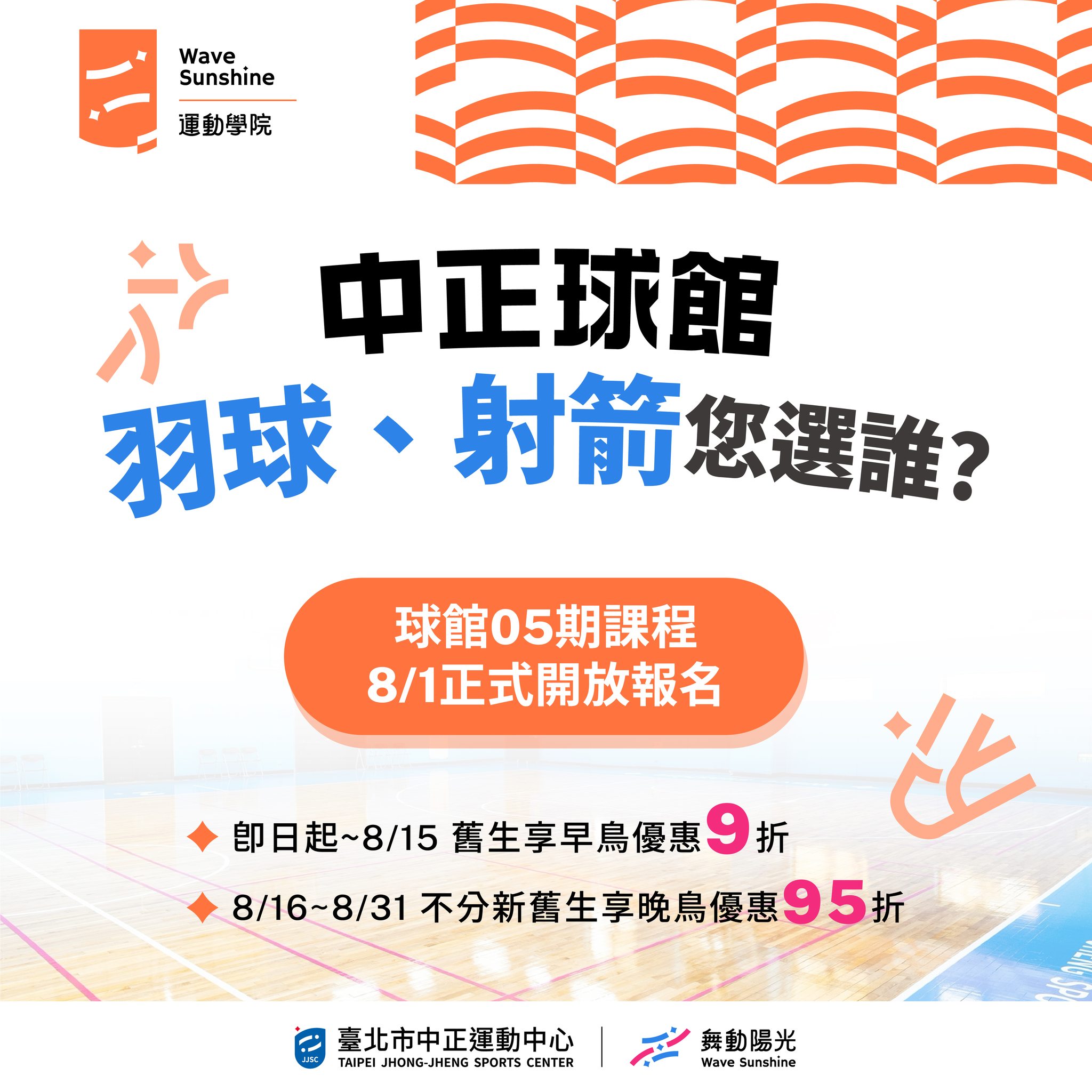 2025-08-15 wsjjscadmin in 最新活動 6843 ☄︎ 中正球館「羽球、射箭」您選誰? 中正運動中心𝟵-𝟭𝟬月𝟬𝟱期球館課程報名開跑 羽球課 ︎ 讓你在羽球場上展現滿滿的自信 射箭課 ➡︎ 讓你帥到連箭都自願飛向靶心 只要報名,我們就讓你變成「球場上的傳說」 報名注意事項 ‣ 𝟴/𝟭-𝟴/𝟭𝟱 舊生續報𝟵折 ‣ 𝟴/𝟭𝟲-𝟴/𝟯𝟭不分新舊生續報𝟵𝟱折
